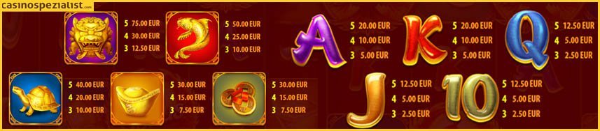 Als Symbole werden die klassischen Kartenwerte 10 – A verwendet. Diese sind für die kleinen Gewinne zuständig. Goldene chinesische Glückssymbole sind für die mittleren und hohen Gewinne zuständig. Die smaragd-farbenen Wilds und der Drache als Bonussymbol sind für Freispiele und Bonus Features zuständig. Das Gesamtbild ist sehr stimmig und hat eigentlich alle Elemente eines klassischen Slots, nur dass eben Glücken und BAR-Symbole durch die chinesischen Glücksbringer ersetzt werden. Die Fernöstliche Atmosphäre ist vor allem auch aufgrund des dezenten Soundtracks wirklich hervorragend eingefangen, aber das überrascht uns bei Quickspin nicht mehr groß. Im Gegensatz zu vielen Studios wurden wir diesbezüglich noch bei keinen ihrer Kreationen enttäuscht.
